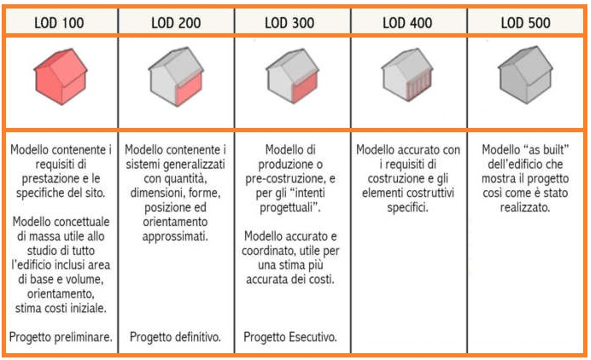 Per restare in tema, la normativa italiana che fa riferimento ai LOD sopracitati è la UNI 11337-4:2017 e sono definiti secondo la scala riportata in seguito: