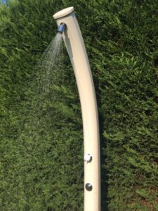 In fact, outdoor showers are a trend in vogue, which adapts the shower design to the style of the architecture of the house and the surrounding environment and can give a distinctive touch to the garden, becoming part of the overall beauty of the outdoor. To create this oasis of peace, a white 09260 solar shower was chosen. It is hidden behind the fence of the house, offering an excellent space of privacy and contact with nature to rinse off after spending the day in the pool. Beside being beautiful, this shower allows saving water and energy thanks to the timed taps that shut off the flow automatically, reducing waste, and to the solar heating system, which does not need pre-heated water. In fact, it has a 30 liter tank and a sun heating system that allows to go from 12° to 34° in an hour.