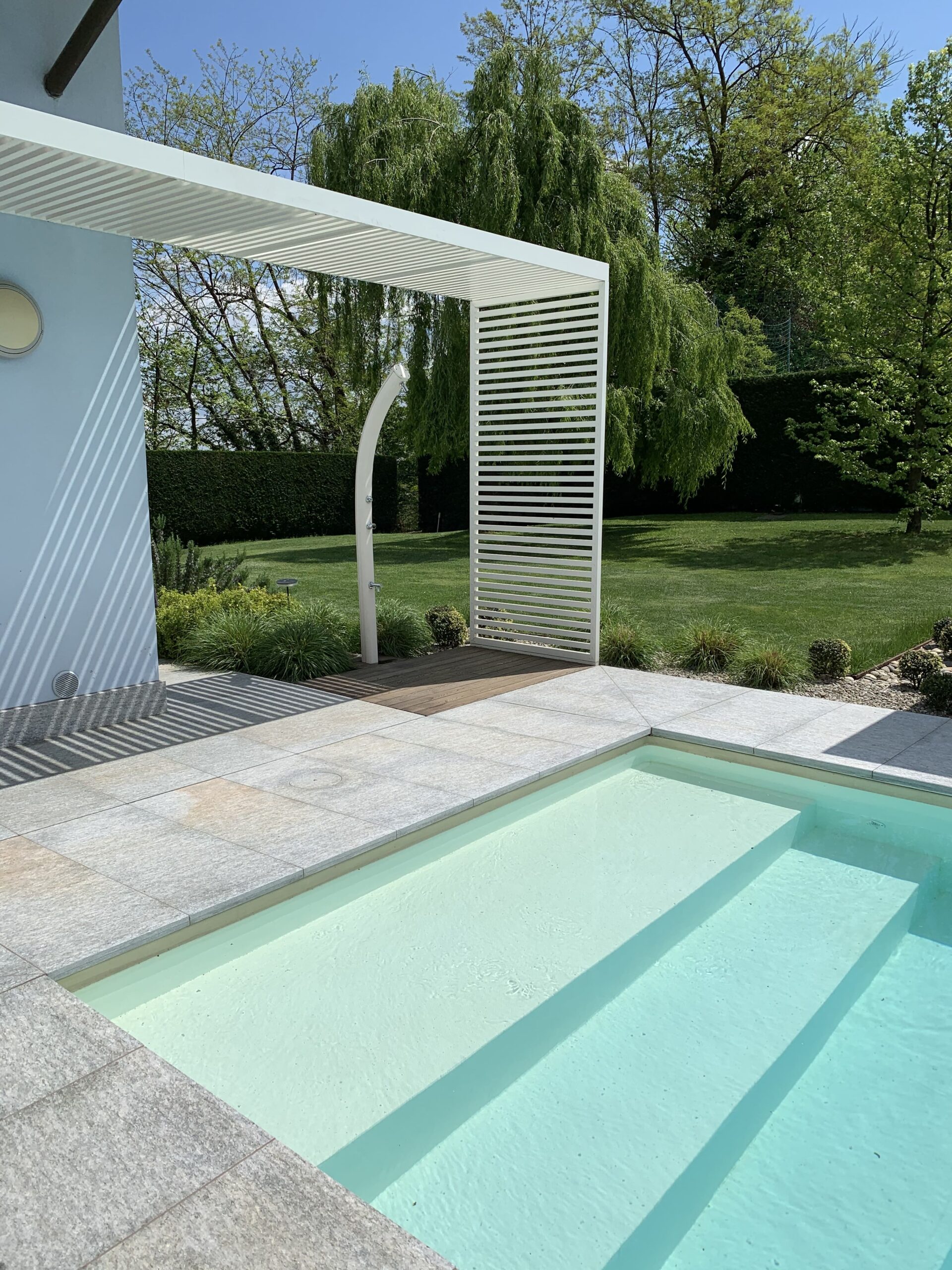 Desde el punto de vista arquitectónico, el diseño de las duchas solares de Idral se integra perfectamente con la estética moderna y minimalista de la villa. La elección de materiales, el respeto por las líneas limpias y la elegancia discreta del diseño contribuyen a crear un ambiente externo cohesivo y visualmente atractivo. El diseño no solo es funcional sino que añade un valor estético significativo al proyecto exterior completo, demostrando que la practicidad no debe sacrificar el estilo.