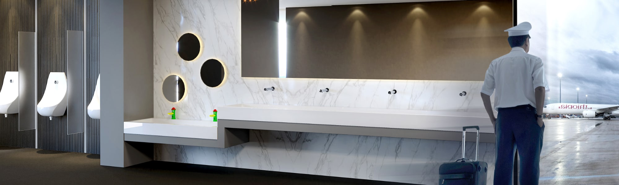 Aeroporti, stazioni, scuole, uffici e centri com- merciali: il mondo è ricco di spazi aperti al pubblico che richiedono bagni funzionali e igienici, capaci di accogliere un elevato flusso di persone. Le soluzioni di rubinetteria e sanitari IDRAL garantiscono quel mix di funzionalità, affidabilità e design capace di rendere gli spazi confortevoli e accoglienti. Come i rubinetti elettronici che, non richiedendo contatti manuali, garantiscono massima igiene riducendo i consumi.