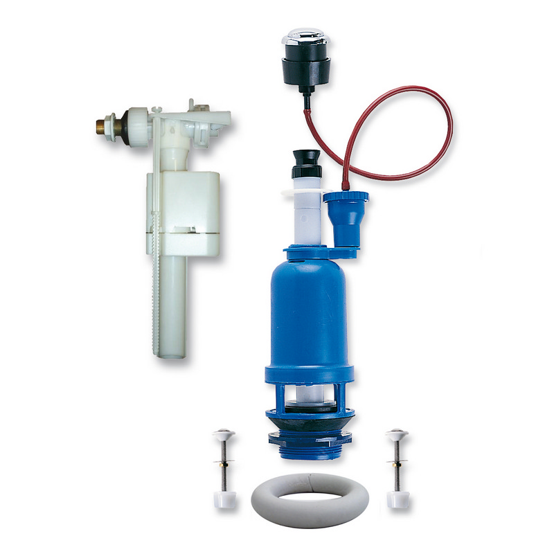 Batteria di scarico per vaso monoblocco serie EASY, modello 15410 di Idral, con comando pneumatico su cassetta. Include una campana in plastica con pulsante cromato pneumatico, galleggiante con attacco 3/8” maschio e guarnizione in gomma per una perfetta tenuta tra vaso e cassetta. Completa di viti per fissaggio e caratterizzata da una velocità di scarico di 1,8 l/sec e una portata del tubo troppopieno di 14 l/min. Soluzione pratica e affidabile per sistemi di scarico efficienti.